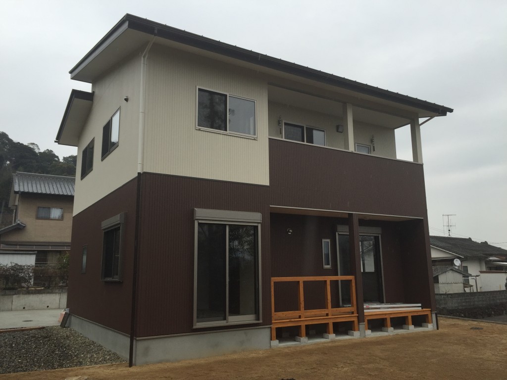 屋根ガルバリウム鋼板葺き、壁サイディング縦貼り、アルミペアガラスサッシ、ウッドデッキ。